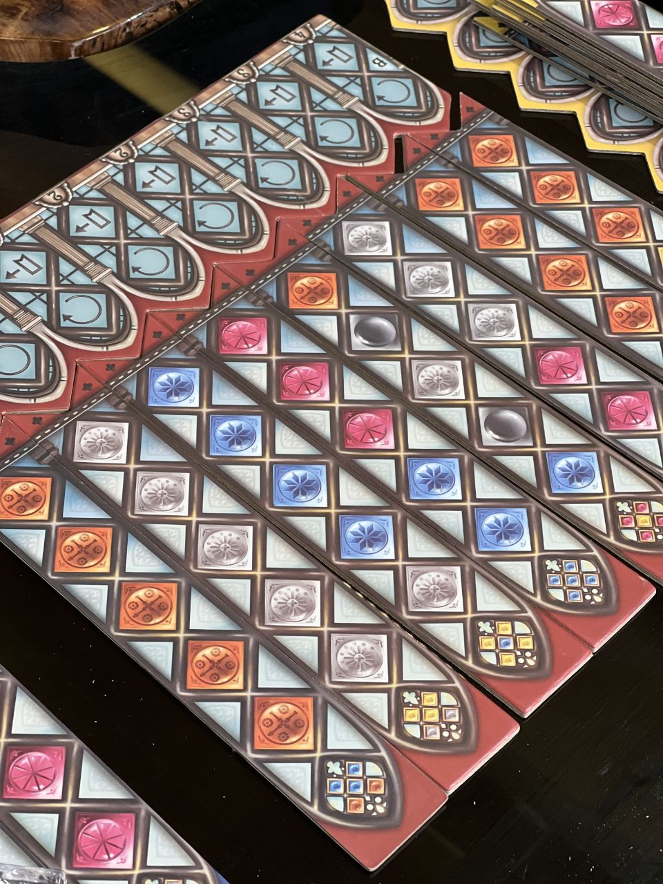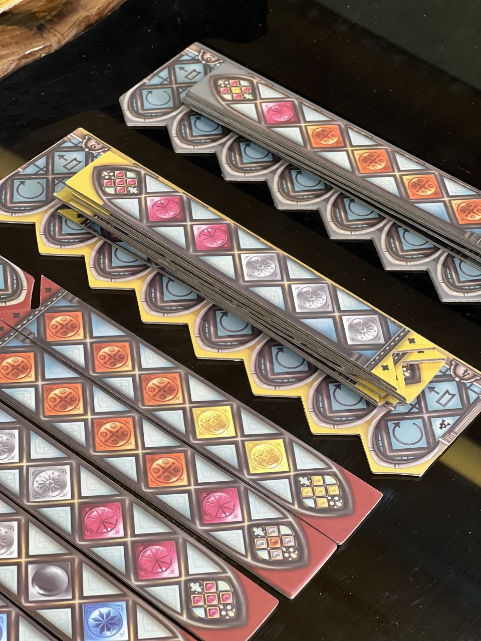 هر بازیکن یک صفحه شخصی دریافت میکند که پنجرههای کاخ او را به تصویر میکشد. اما نوآوری اصلی در نوارهای الگوی پنجرهها نهفته است. این نوارها که در بالای صفحه بازیکن قرار میگیرند، همگی دوطرفه هستند.1 این ویژگی در کنار چیدمان تصادفی آنها در ابتدای هر بازی، تنوعی تقریباً بینهایت (infinite variability) ایجاد میکند و تضمین میدهد که هیچ دو بازیای شبیه به هم نخواهد بود. هر بار که بازی را آغاز میکنید، با یک پازل استراتژیک کاملاً جدید روبرو هستید.