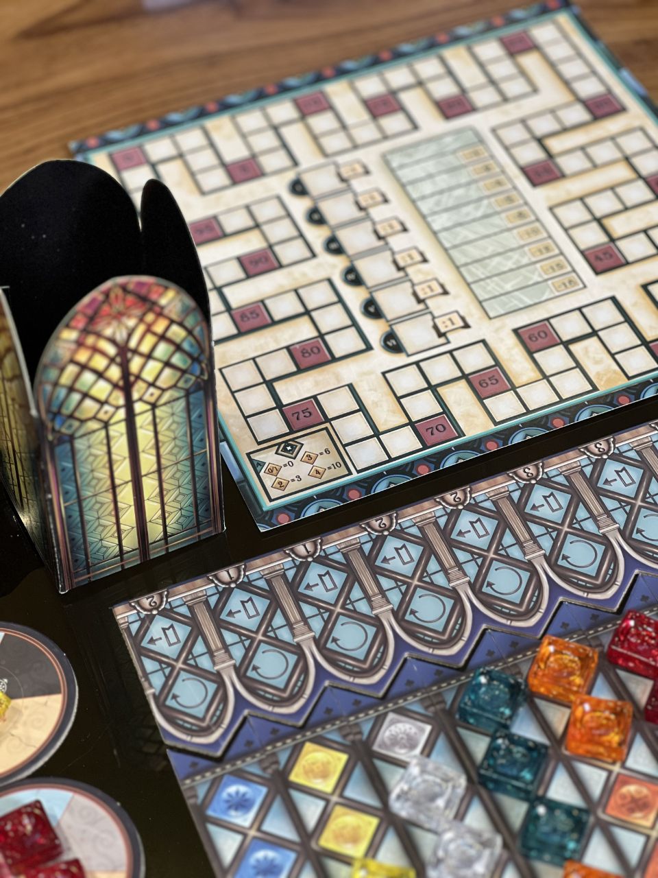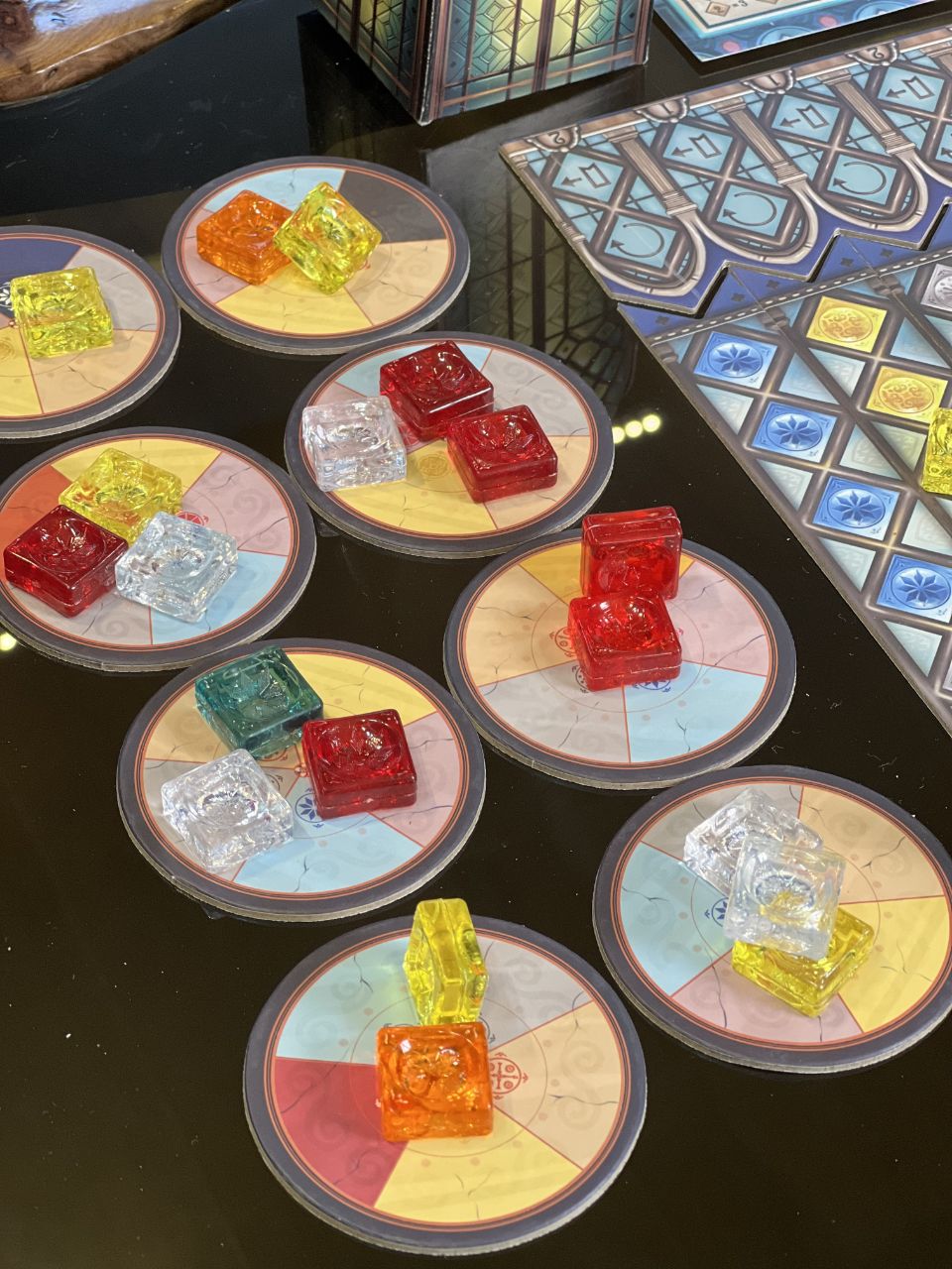 هر بازیکن یک مهره چوبی به نام «شیشهگر» در اختیار دارد. این مهره که روی نوارهای الگوی شما حرکت میکند، یکی از کلیدیترین مکانیزمهای جدید بازی است و لایههای عمیقی از استراتژی و زمانبندی را به گیمپلی اضافه میکند که در ادامه به تفصیل به آن خواهیم پرداخت.