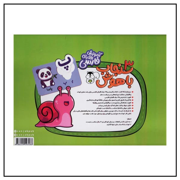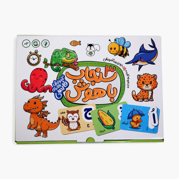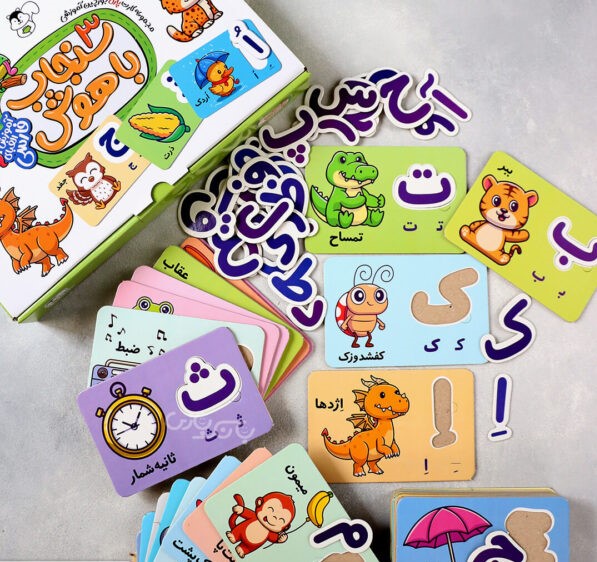 دربردارندۀ ۳۵ کارت ۱۰×۱۵ سانتیمتر و ۳۵ حرف الفبای فارسی برای رشد مغزی کودک و افزایش عملکرد نیم کرههای چپ و راست مغز