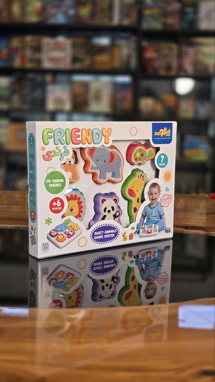 از 6 ماهگی به بعد کودکان می توانند از دستانشان به صورت هدفمند استفاده کنند. یعنی چیزی را بردارند و آن را سر جایش بگذارندو کم کم مفهوم تشابه را درک میکنند. بازی فرندی زینگو می تواند به خوبی این مفهوم را به کودکان آموزش دهند. در این بسته ی اسباب بازی 7 قطعه حیوانات سایز درشت با تصاویر بسیار زیبا قرار دارد که کودک باید آن ها را در سر جای خود روی صفحه ی اصلی قرار دهد.
