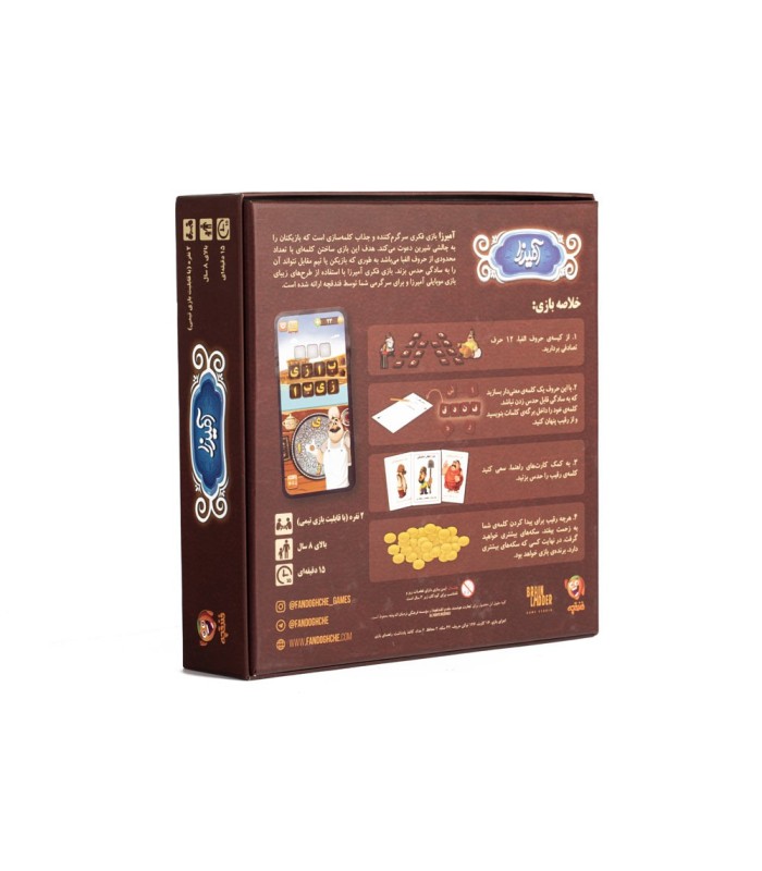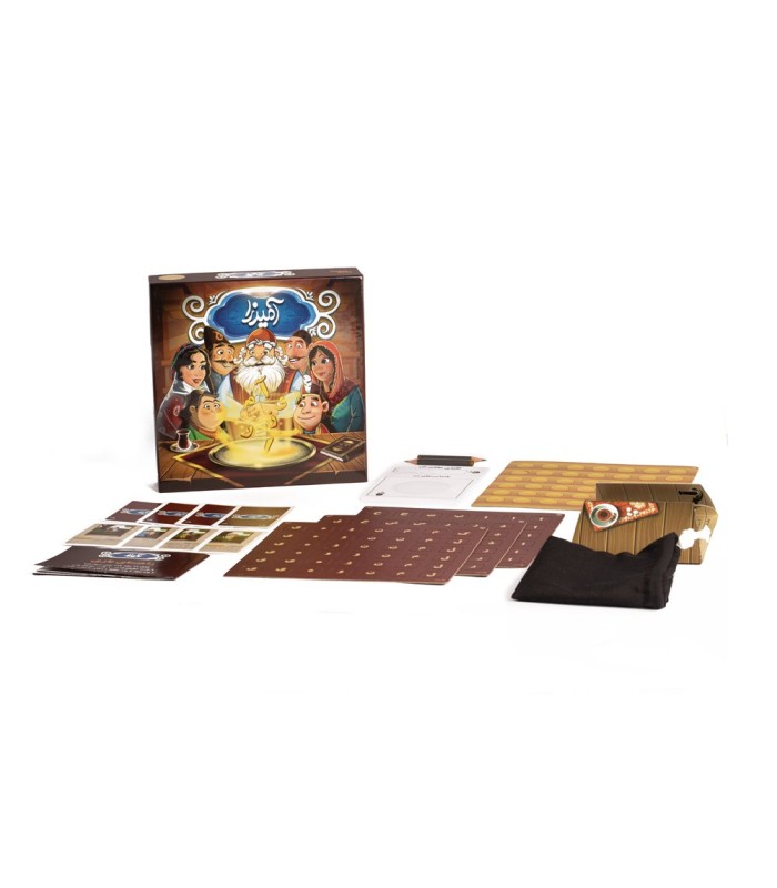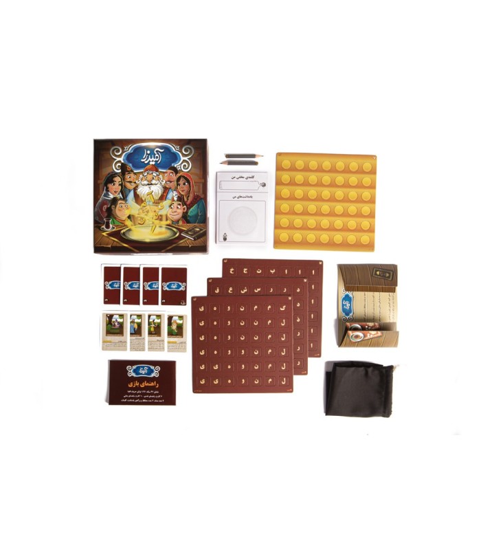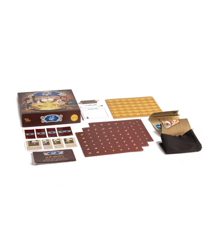 شامل 42 سکه، 126 توکن حروف الفبا، 6 کارتِ راهنمای قندی، 10 کارتِ راهنمای چایی، 2 عدد مداد، 2 عدد محافظ و برگهی یادداشت کلمات