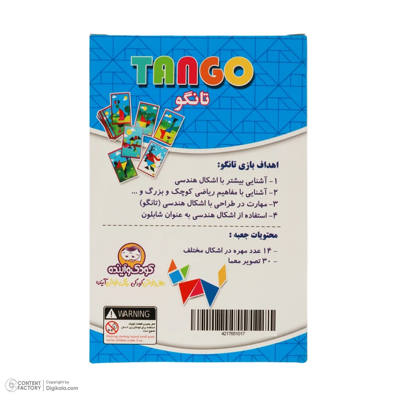 تانگو یک بازی آموزشی و سرگرم‌کننده است که شامل مجموعه‌ای از اشکال هندسی و کارت‌های فلش است. بازیکنان می‌توانند با استفاده از این اشکال هندسی و کارت‌های فلش، اشکال پیچیده‌تر را طراحی کرده و مهارت‌های خود در زمینه‌های فضایی، خلاقیت، تمرکز و دقت را تقویت کنند.