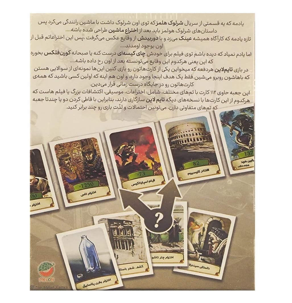 در بازی فکری تایم لاین هر کارت حاوی یک اتفاق تاریخی در هر دو سمت خود است. اما سالی که آن اتفاق افتاده فقط در یک سمت کارت نوشته شده است! بازیکنان به نوبت هر کدام یک کارت از دستشان بر روی میز بازی می کنند.