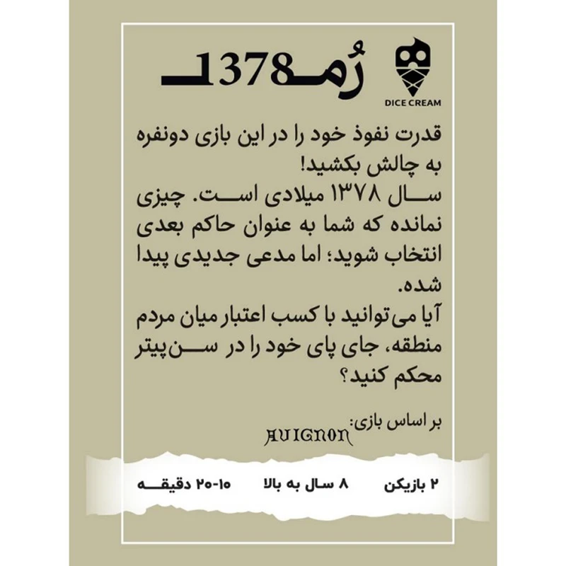 در سال 1378 میلادی، در دل رقابتهای پاپ نشینی، شما باید برای تصاحب کرسی مقدس سن پیتر تلاش کنید. رقبای قدرتمندی در کمین شما هستند. آیا میتوانید با نفوذ در میان مسیحیان و تقویت جایگاه خود در کلیسا، این چالش بزرگ را پشت سر بگذارید و به عنوان پاپ بعدی برگزیده شوید؟ بازی ایرانی روم در واقع برگردانی از بازی خارجی Avignon میباشد که در حال حاضر محبوبیت زیادی پیدا کرده است. این بازی دو نفره برای افراد بالای 8 سال مناسب است و حدودا 15 دقیقه به طول میانجامد.