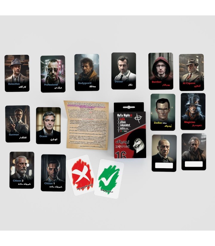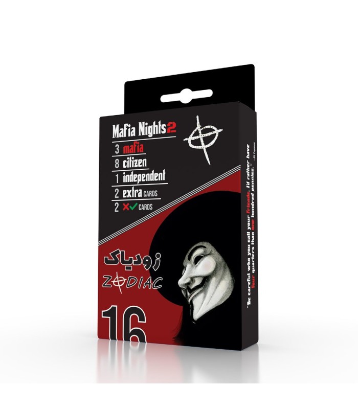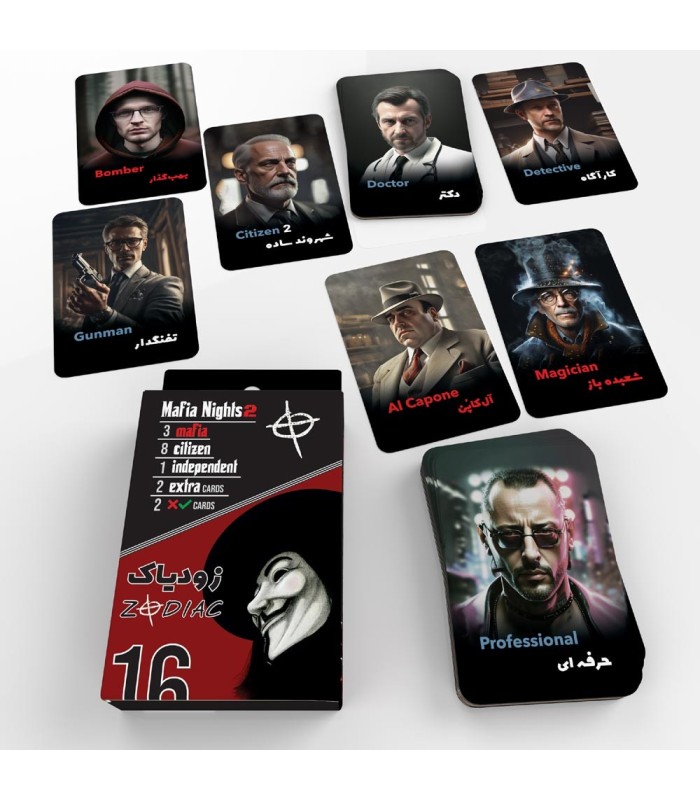 بازي فکري مدل سناريو زودياک شبهاي مافيا داراي 16 کارت بازي ميباشد ( 3 کارت تيم مافيا ، 8 کارت شهروندي ، 1 کارت مستقل (زودياک) ، 2 کارت بي نام و دو کارت تيک و ضربدر )  به روش سناريو شبهاي مافيا:زودياک فيليمو و سناريو پدرخوانده طراحي و توليد شده است. برگه راهنما درون محصول براي آموزش شوي شب هاي مافيا: زودياک ، روش بازي و توضيح نقشها را مفصل توضيح ميدهد ، قصد اوليه طراحي و توليد اين محصول صرفا کمبود کارت کامل و مقرون به صرفه در بازار بود ، در نتيجه پس از استقبال علاقه مندان و دريافت نظرات متعدد ، اقدام به توليد اين محصول نيز نموديم . جنس کارتها گلاسه 145 گرمي دورو چاپ با روکش سلفون مات بوده که مقاومت آنها را چند برابر مي کند.