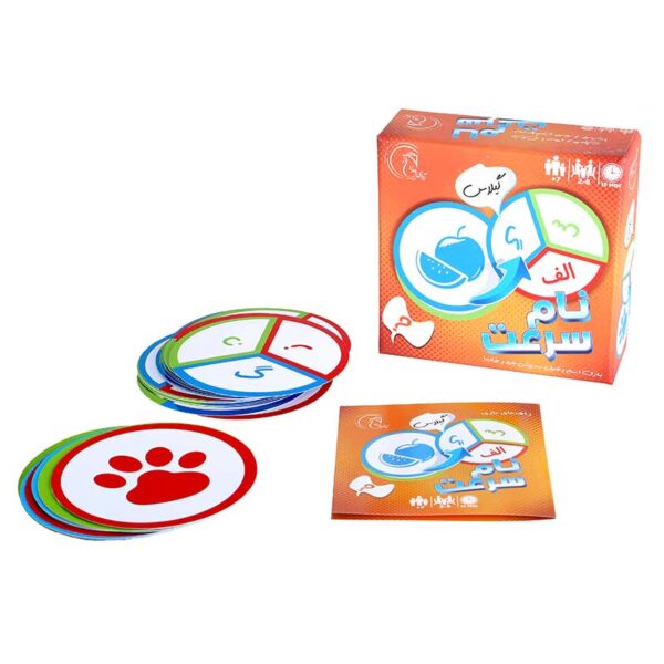 بازی آموزشی نام سرعت همان بازی آشنا و محبوب اسم فامیل است که به روشی بسیار ابتکاری و البته با سرعتی بالاتر انجام میشود. در این بازی 10 نوع دستهبندی وجود دارد، شامل: نام، میوه، حیوان، رنگ، شهر، کشور، اعضای بدن، اشیاء، غذا و ماشین. این دستهبندیها به سه رنگ متفاوت در پشت کارتها چاپ شدهاند و روی هر کارت 3 حرف الفبا به همان سه رنگ وجود دارد.