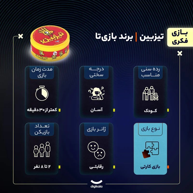 تیزبین شامل مجموعهای از کارتهای دایرهای است که روی هرکدام چند تصویر وجود دارد. بین هر دو کارت دقیقاً یک تصویر مشترک وجود دارد که بازیکنان باید آن را پیدا کنند. بازی را میتوان به روشهای مختلف (5 بازی متفاوت) اجرا کرد و هر روش، هیجان خاص خودش را دارد.