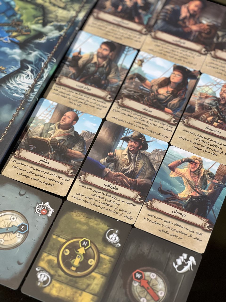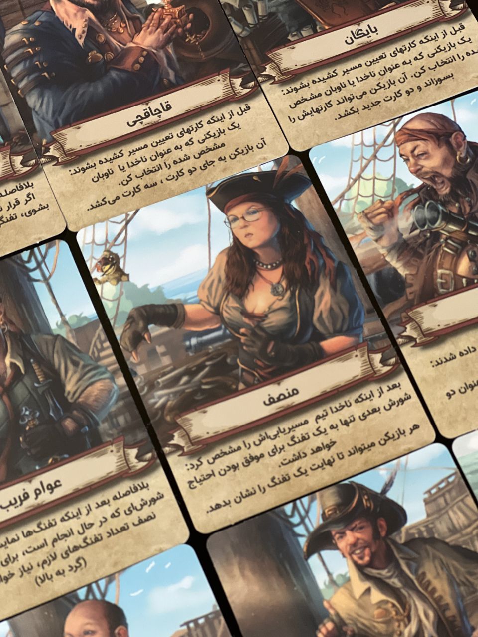نسخهی ایرانی این بازی که توسط گروه «گنجفه» تولید شده، از کیفیت مطلوبی برخوردار است و شامل تمام اجزای لازم برای یک تجربهی کامل است. محتویات جعبه شامل صفحهی بازی دو رو، مهرهی کشتی، تفنگها، کارتهای شخصیت، کارتهای هدایت، توکنهای مختلف و دفترچه راهنماست. لازم به ذکر است که نسخههای خارجی این بازی دارای یک ویرایش لوکس (Deluxe Edition) با مینیاتورهای زیبا نیز هستند که نشان از جایگاه ویژهی این بازی در سطح جهانی دارد.