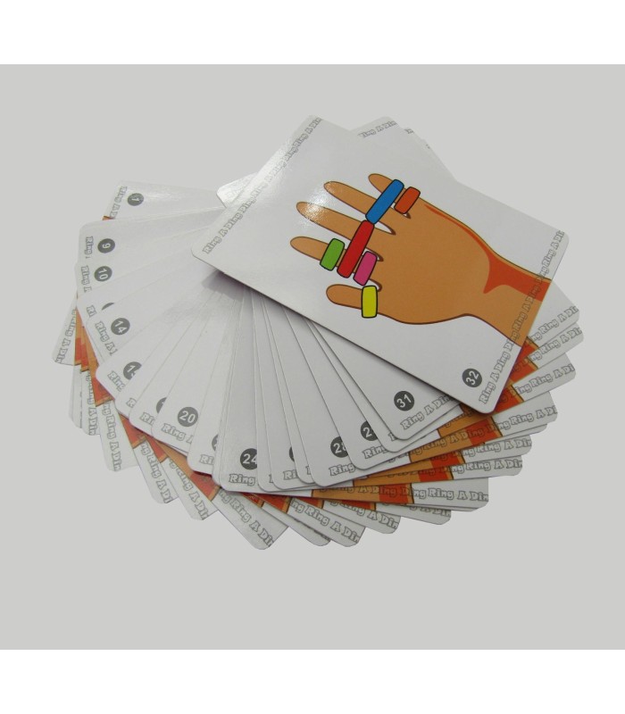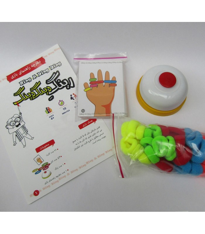 بازی فکری و هیجانی رینگ دینگ دینگ یک چالش هیجان انگیز برای هماهنگی ، دقت و سرعت عمل است. این بازی مناسب مهمانی ها و جمع های خانوادگی و دوستان است. بازیکنان کارت ها را برمی دارند و به سرعت کش های رنگی را از روی زمین می قاپند تا طرح کارت را با کش های رنگی روی انگشتان دست خود درست کنند. اولین نفری که چیدمان کش ها را به دور انگشتانش تمام کند زنگ بازی را به صدا در آورده و بازی را در آن دور برنده می شود.