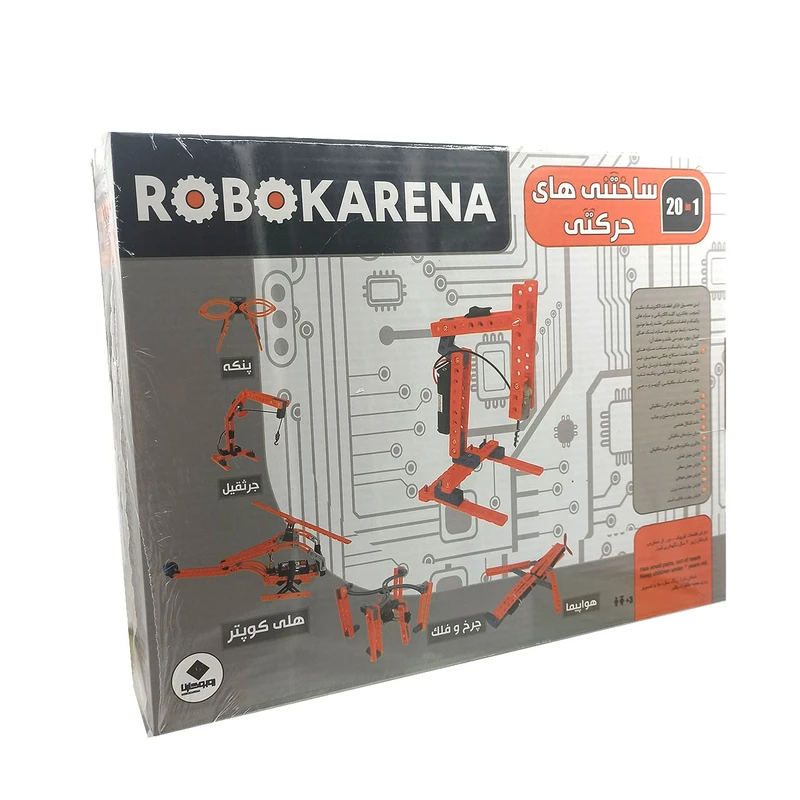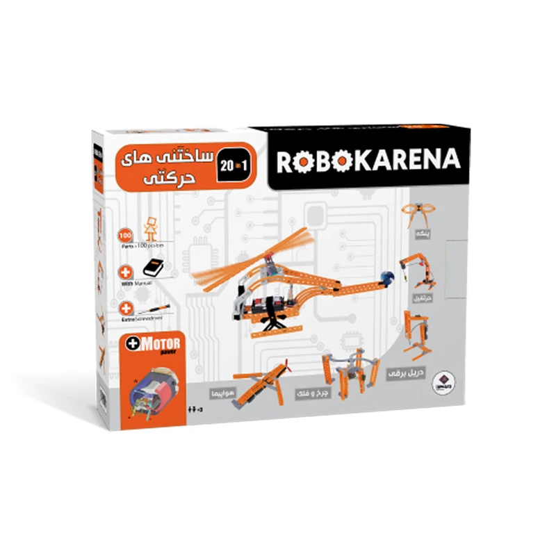 ساختنی های حرکتی روبو کارنا 20 در یک، آموزش ساخت ۲۰ ساختنی حرکتی دریل برقی بالابر برقی جرثقیل هلیکوپتر هواپیما قایق هاورکرافت ربات انسان نما چرخ و فلک و… شامل ۱۴۶ قطعه پیچ گوشتی سازه های مکانیکی پیچ و مهره قطعات الکترونیک و…