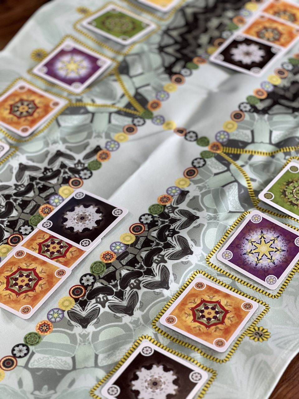 در ماندالا، دو بازیکن در اطراف یک صفحه پارچهای با طرح دو دایرهی ماندالا مینشینند. بازیکنان نوبتبهنوبت کارتهای رنگی خود را در نواحی خاصی از این دایرهها (کوه، رودخانه، یا زمین خودشان) بازی میکنند.