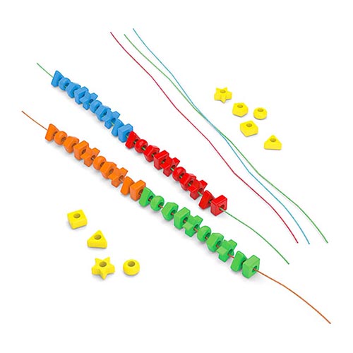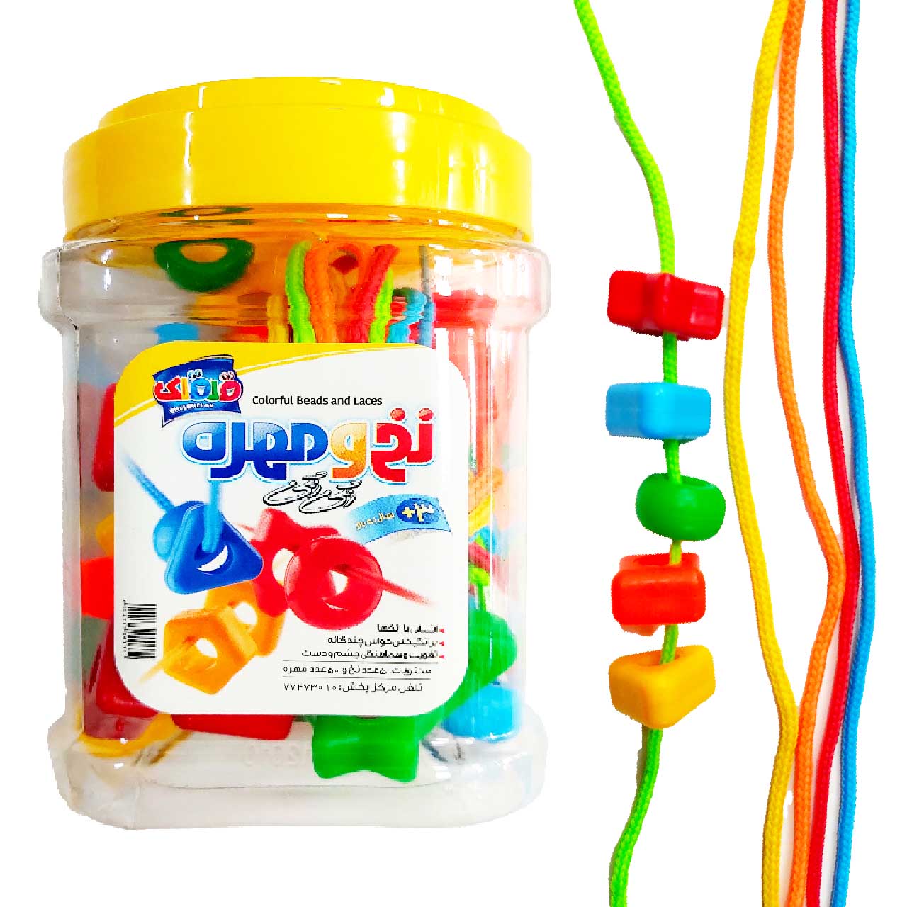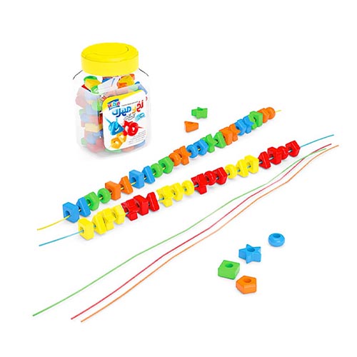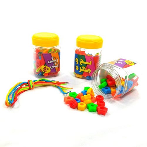 این وسیله شامل 50 مهرهی پلاستیکی در رنگهای درخشان و شکلهای متنوع و 5 بند بافتهی رنگی است. صِرف نخ کردن مهرهها فعالیتی جذاب و در عین حال مفید برای کودکان به شمار میرود.