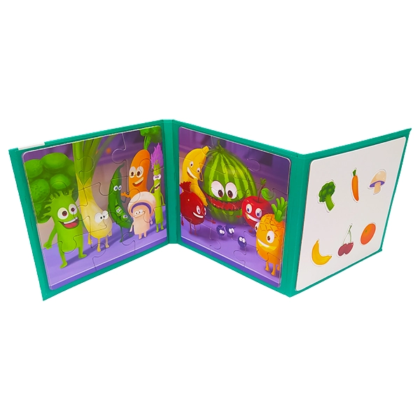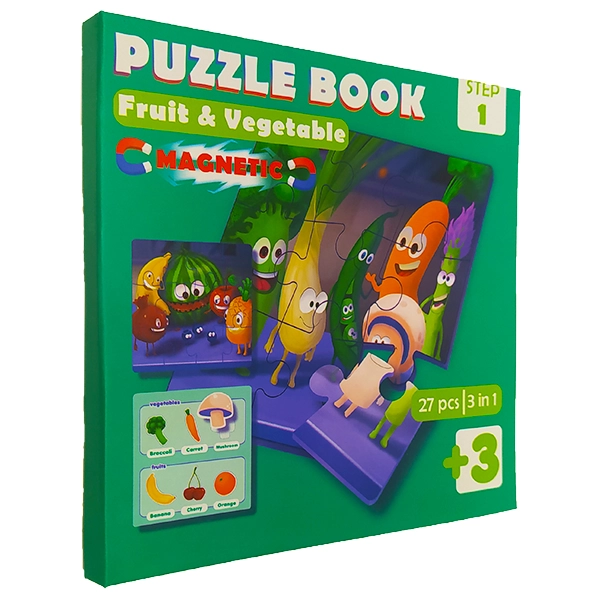 این مجموعه دارای ۲۷ قطعه مغناطیسی با طرح میوهها و سبزیجات رنگارنگ است که کودک میتواند آنها را روی صفحه مغناطیسی داخلی کتاب بچیند.