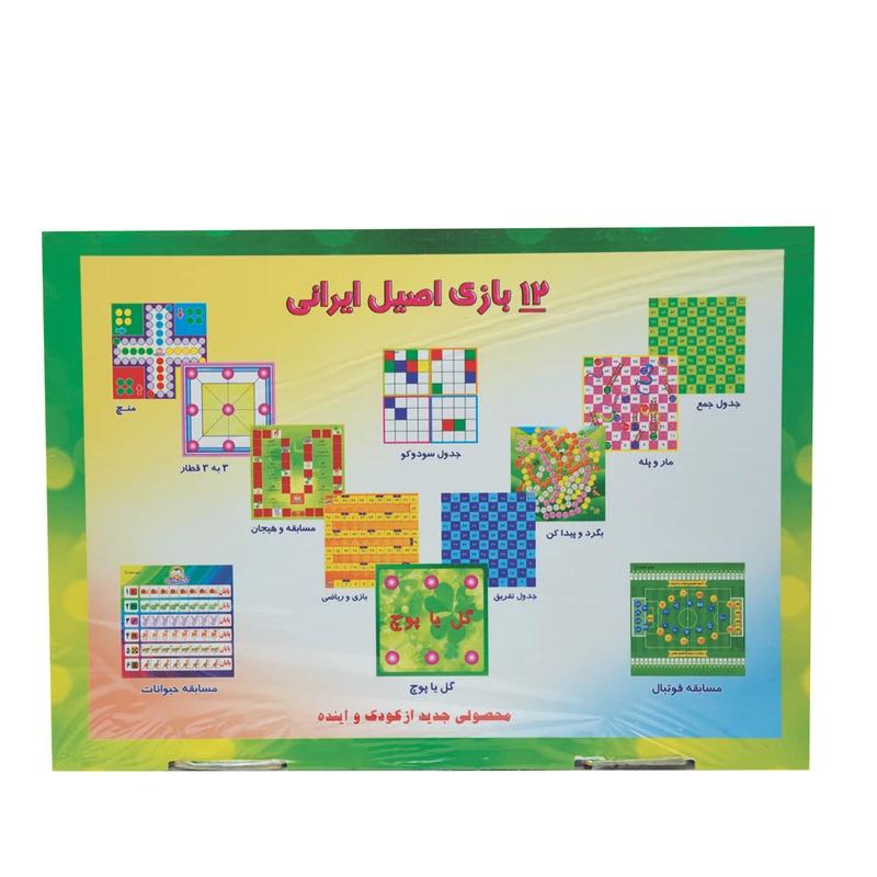 12 بازی اصیل ایرانی محصول کودک و آینده است که دراینبسته 12 بازی فکری از قبیل جدول جمع ، مار و پله ، بگرد و پیدا کن ، جدول سودوکو، جدول تفریق ، گل یا پوچ، بازی و ریاضی ، مسابقه هیجان ، 3 به 3 قطار ، مسابقه حیوانات و منچ وحود دارد . این بسته مناسب برای تمام اعضای خانواده متناسب با هر سلیقه ای در بازی می باشد که می توانند با خرید یک بسته چندین بازی متفاوت را با هم انجام دهند .