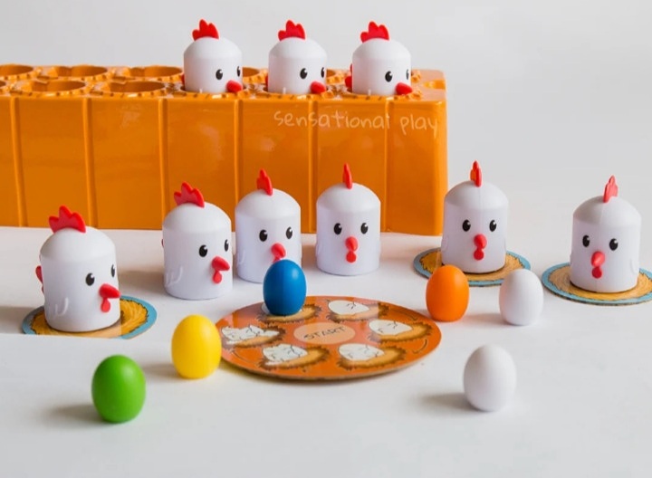 (2بازی در 1 جعبه،حاوی:8 لانه،6 مرغ،6 تخم مرغ سفید،4 تخم مرغ رنگی،4 زمینه رنگی،تاس و برچسب تاس،بروشور بازی،مناسب بالای 4 سال،تعداد بازیکن:2 الی 4 نفر،مدت بازی:20 دقیقه،باجعبه)