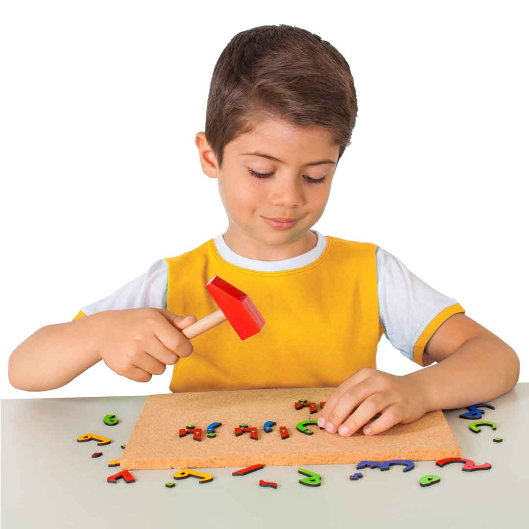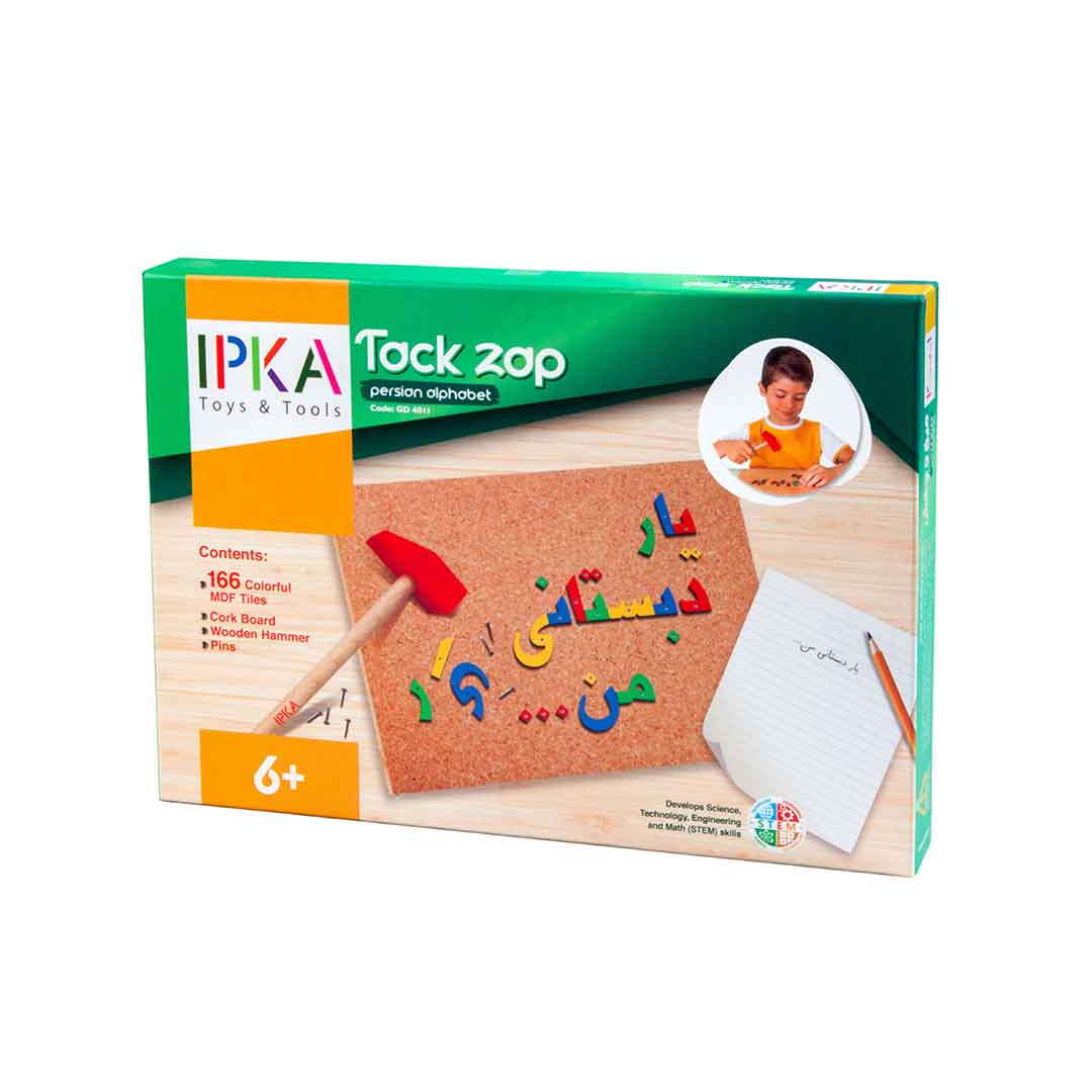 استفاده از میخ و چکش برای کوبیدن حروف رنگارنگ فارسی روی صفحه چوب پنبهای، مهارت دستورزی را در کودک تقویت میکند. بازی میخ و چکش الفبا فارسی ایپکا با هدف تسهیل آموزش الفبا به کودکان طراحی و تولید شده است.