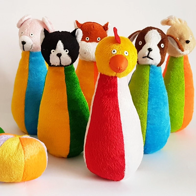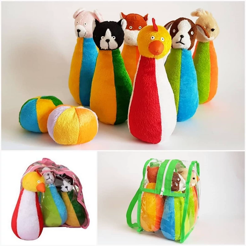 ست بولینگ کودک شامل 6 پین و 2 توپ کوچک میباشد. این ست بولینگ کودکانه با جنس پولیشی درون یک کوله ی پلاستیکی قرار گرفته و به راحتی همه جا قابل حمل است. بولینگ حیوانات به دلیل جنس پارچه ای و ابری که دارد، محصولی سبک و استفاده از آن برای کودکان آسان و بی خطر است. بولینگ پولیشی کودک بدون لبه تیز و آسیب رسان یک سرگرمی عالی برای داخل و بیرون از خانه است که موجب تقویت قدرت حسی حرکتی و مهارتهای جسمی و روانی کودک می شود. این بولینگ کودک دوست داشتنی با داشتن 6 عدد عروسک پولیشی حیوانات یک انتخاب عالی برای بالای 3 سال است.