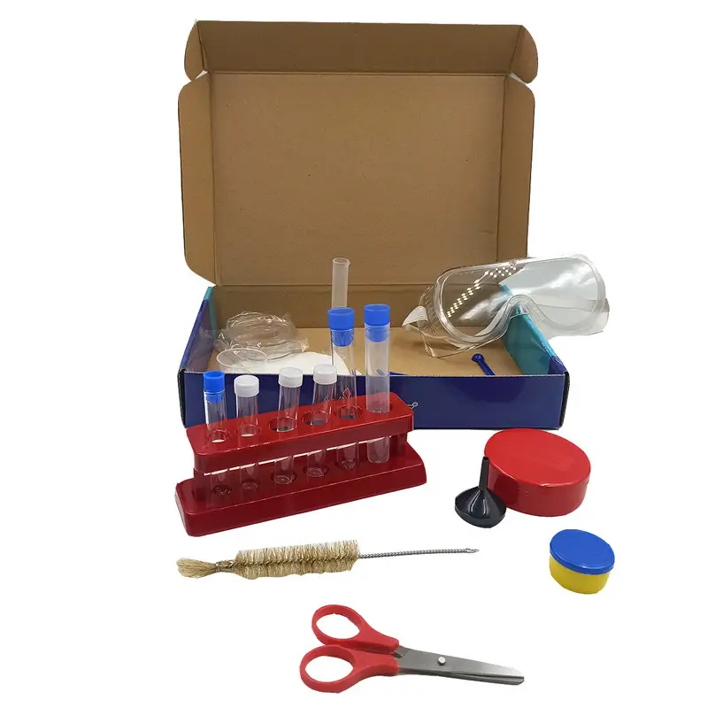 شامل عینک ایمنی، لوله آزمایش شیشه ای، لوله آزمایش پلاستیکی، قفسه نگهدارنده لوله آزمایش، لوله استوانه مدرج، لیوان مندرج، ذره بین، قیچی، پنس، قطره چکان، پیمانه اندازه گیری، ظرف کشت سلول و میکروب، قیف، کاغذ صافی، برچسب، ظرف نگهداری نمونه، لام، برس شستشوی لوله و پوستر جدول تناوبی عناصر می‌باشد.
