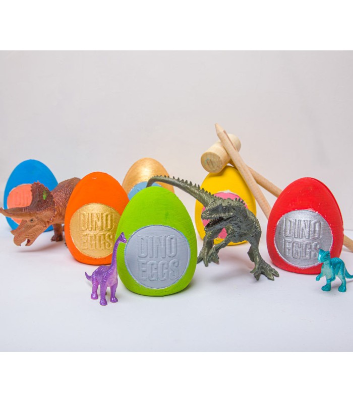 محتویات: 4 عدد تخم دایناسور، قلم و چکش چوبی و سفره ی کار