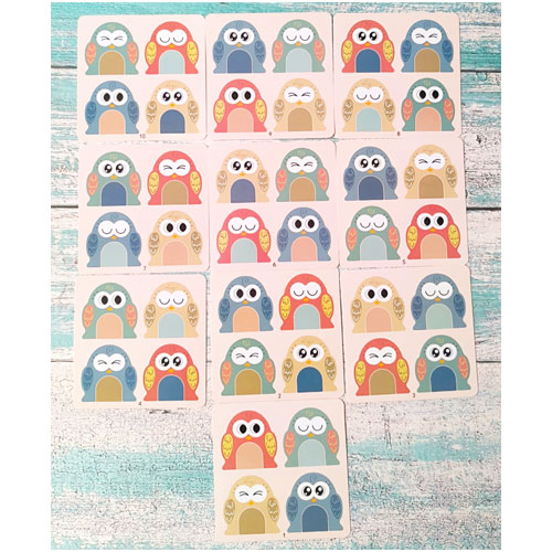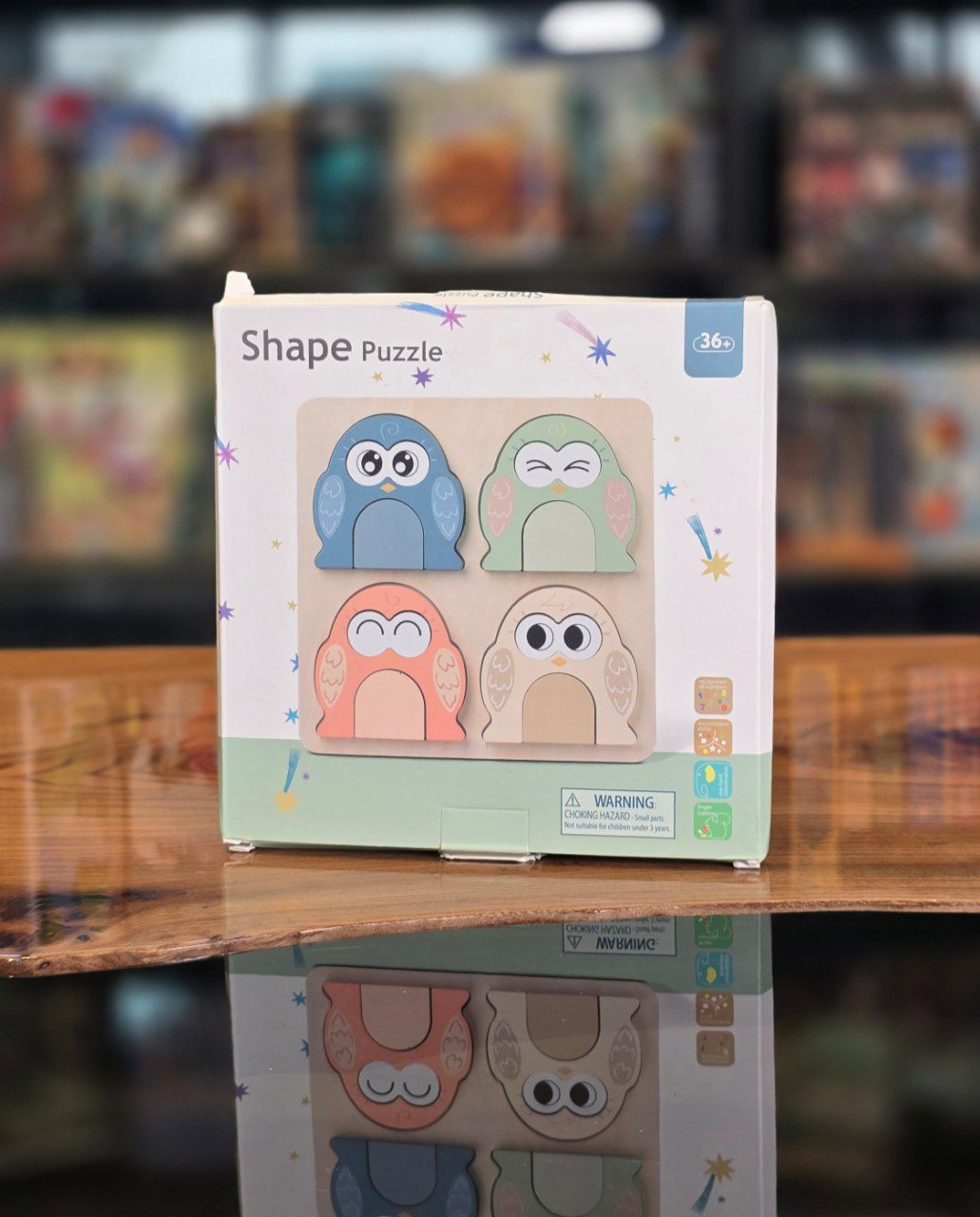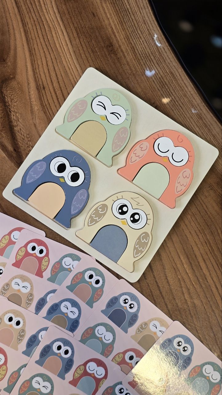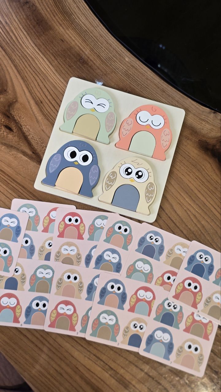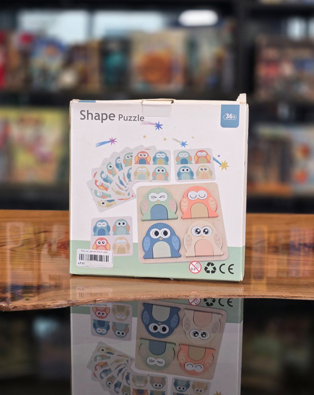 پازل چوبی حالت های چوبی از یک صفحه چوبی در ابعاد 18 در 18 سانتی متر به همراه قطعاتی به شکل جغد بر روی صفحه طراحی شده است. همراه این اسباب بازی فکری 10 عدد کارت الگو پشت و رو قرار دارد که کودک باید با توجه کارت های الگو قطعات را بچیند.