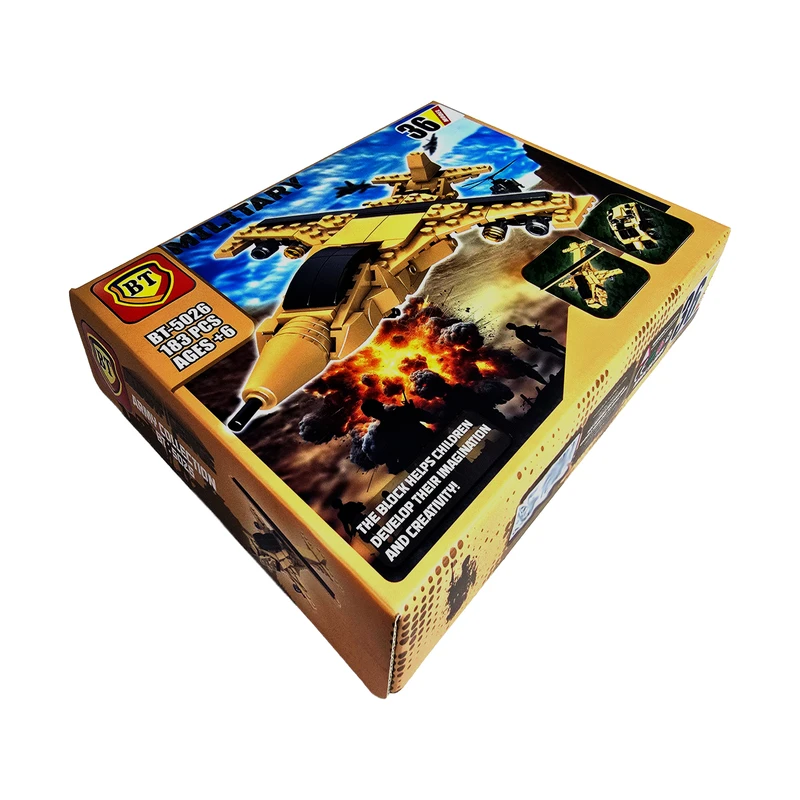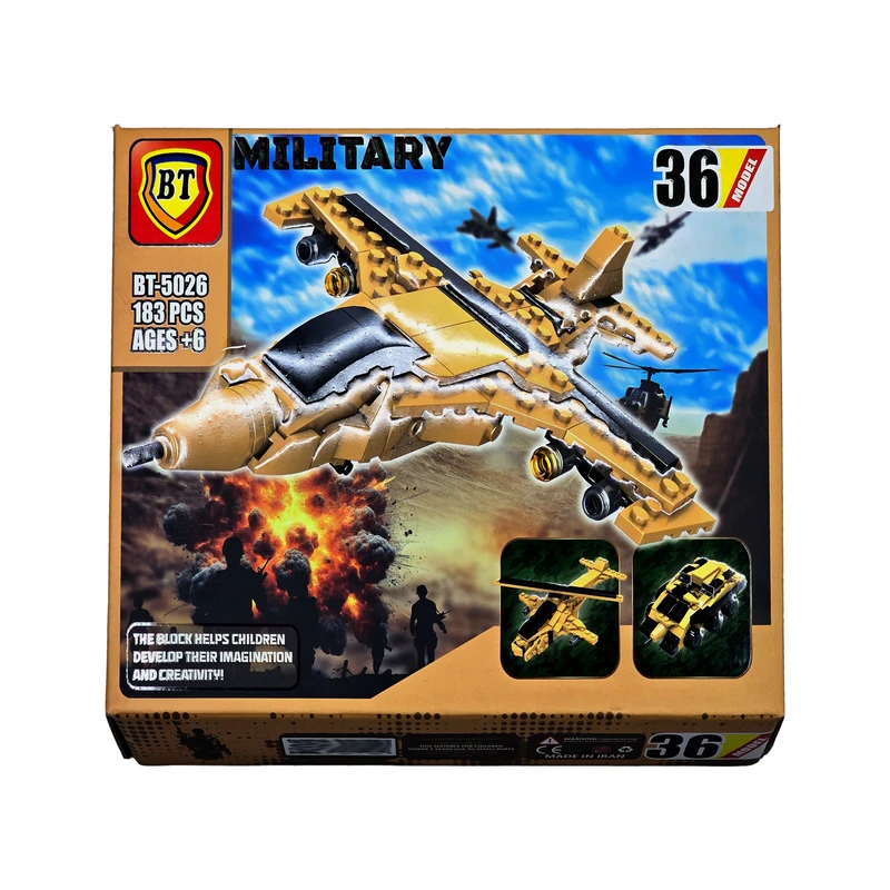 لگو BT-5026 صدو هشتادو سه تکه ساخت ایران است .که با کیفیت عالی برای تقویت استعداد و حافظه فرزندان عزیز ایران ساخته شده است.این لگو برای سن بالای 6 سال توصیه می شود. با خرید یک پک از این محصول می توان 36 عدد بازی شامل هواپیما و تانک و نفر بر مختلف را ساخت.