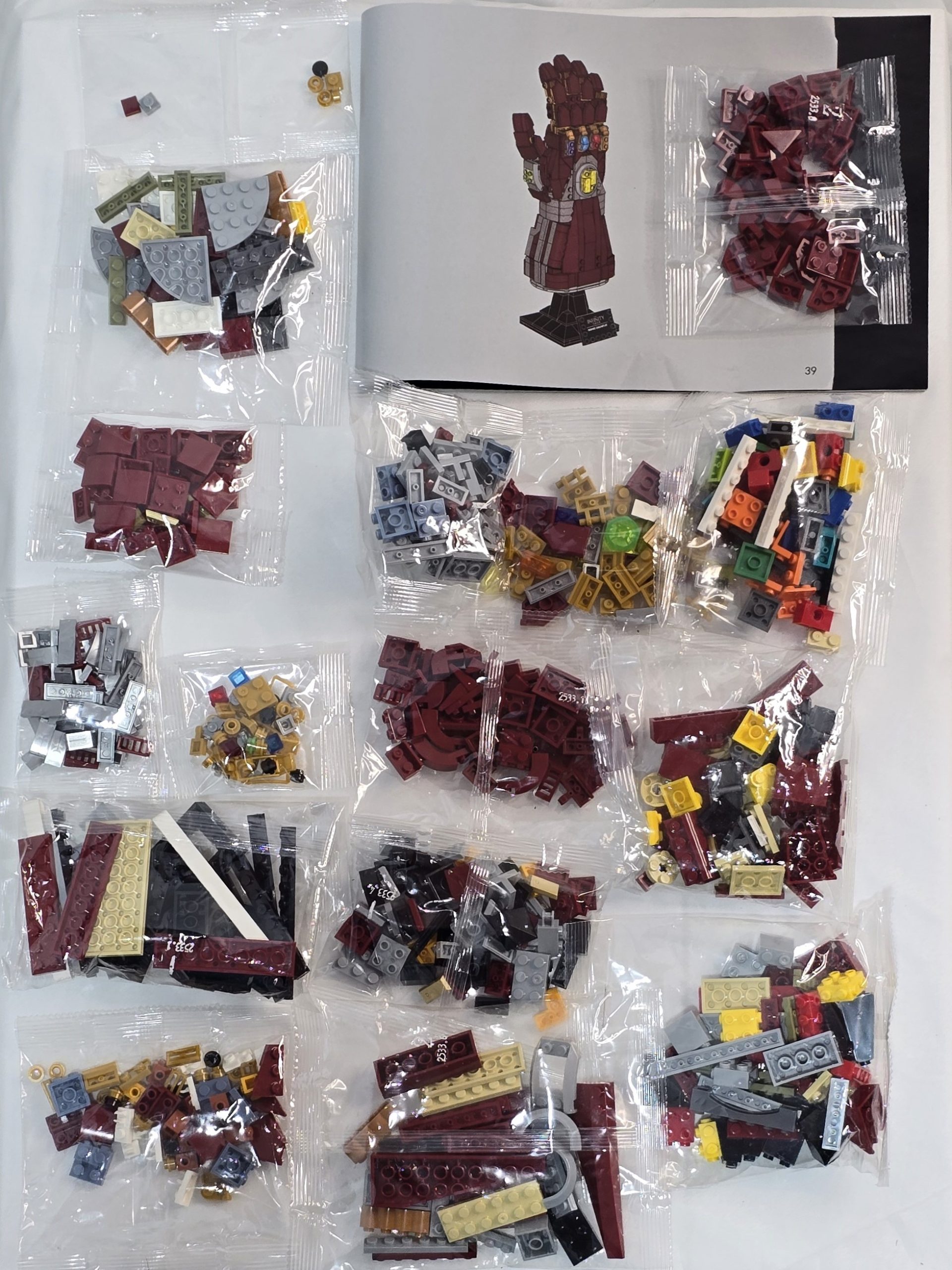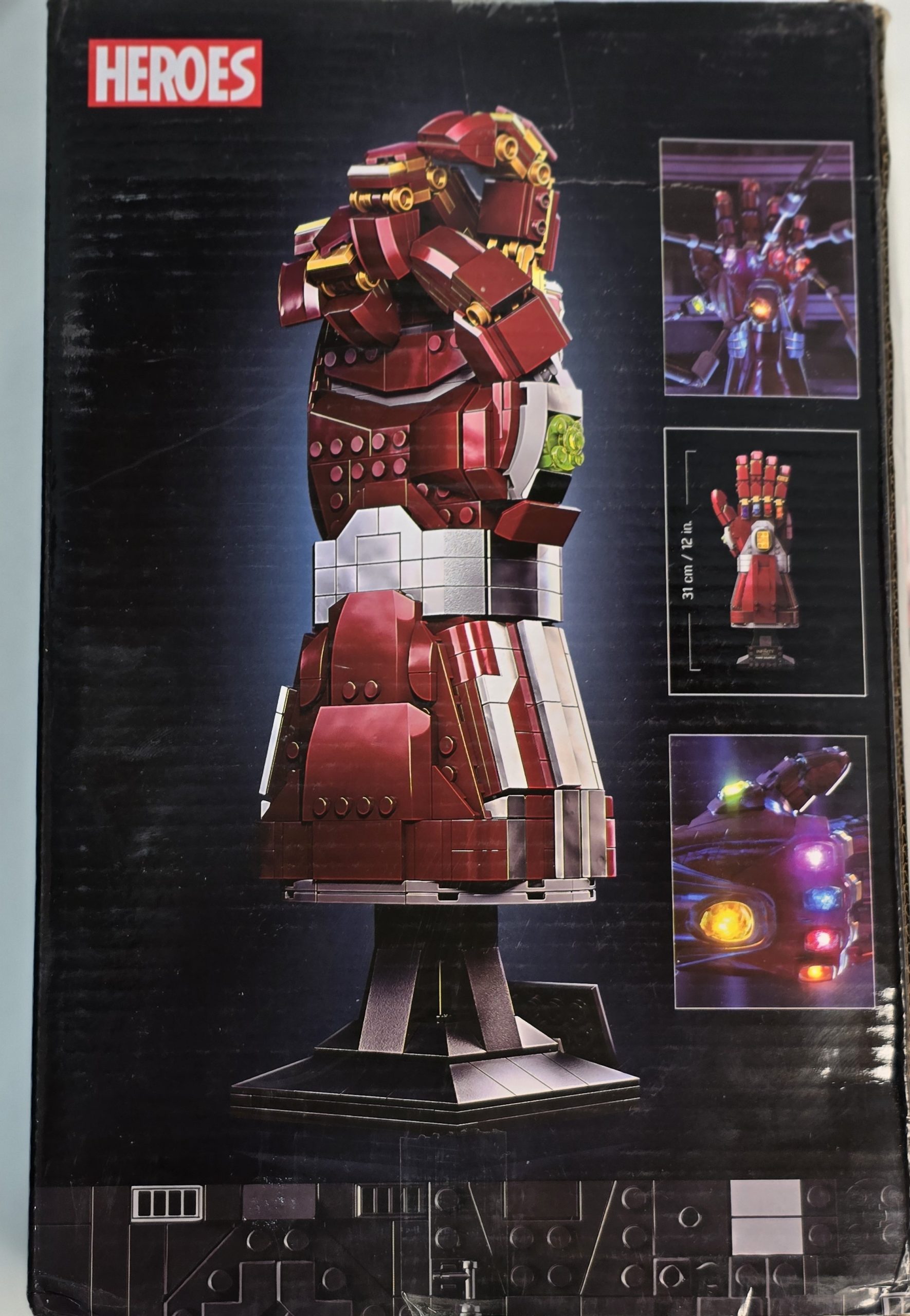 دستکش بینهایت آیرون من، محصولی ساخته شده برای نبرد با تانوس در آخرین نبرد. قطعات این مجموعه سازکاری امل با بلوکهای لگو دارند. دستکش بینهایت را بسازید، طلسم خود را انتخاب کنید و در آخرین نبرد به کمک انتقامجویان بشتابید.