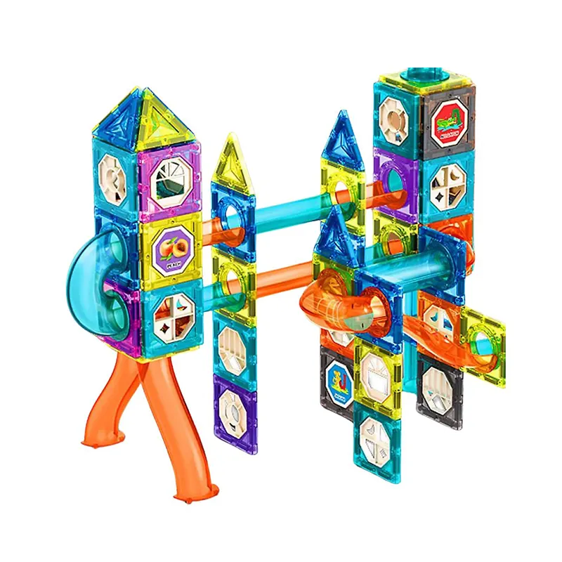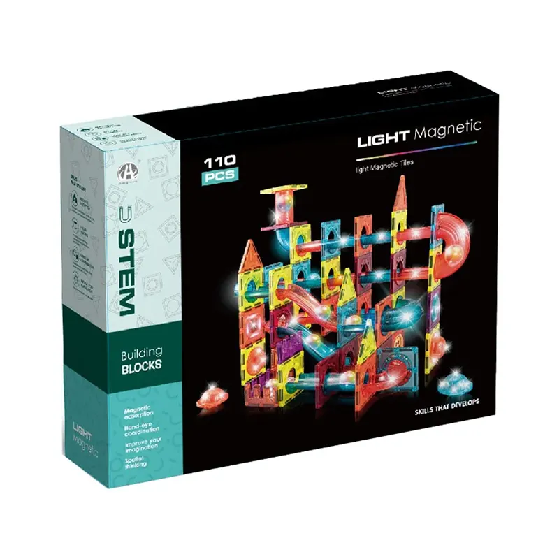 اسباب بازی کاشی های مغناطیسی 110 تکه چراغدار، یک اسباب بازی آموزشی و ساختنی هیجان انگیز برای خلاقیت کودکان بالای 3 سال است. با کمک قطعات پلاستیکی و رنگارنگ مغناطیسی و سرسره های رنگی موجود در بسته بندی، سازه های خلاقانه بسازید.