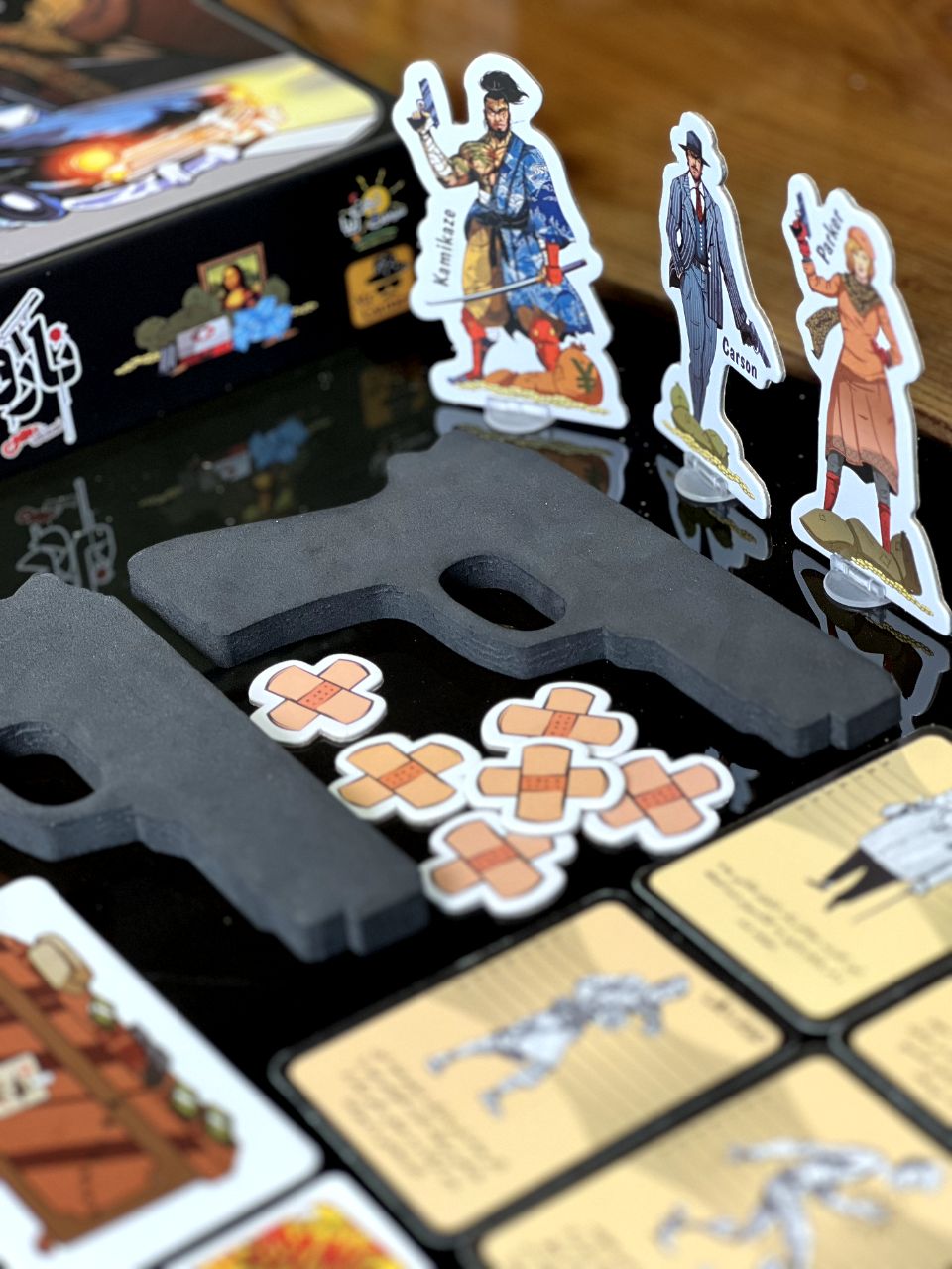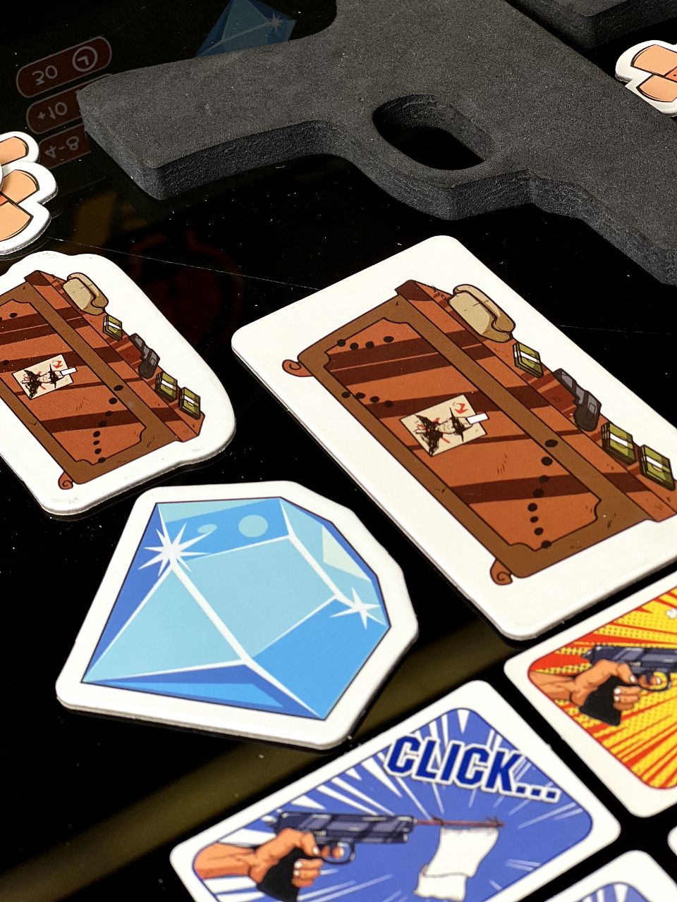 – بَنگ!: بازیکنِ هدف، زخمی می‌شود (و یک توکن زخم دریافت می‌کند)! او یک زخم برداشته و کاراکتر خود را روی زمین می‌خواباند. بازیکنانی که در یک دور، گلوله خورده و زخمی می‌شوند، نمی‌توانند در تقسیمِ غنائمِ آن دور، شرکت کنند!