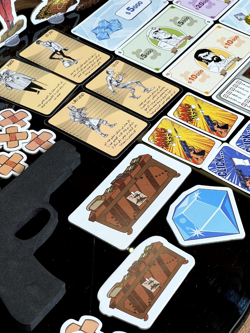 11) 64 کارت سهم (15 اسکناس 5هزار دلاری، 15 اسکناس 10هزار دلاری، 10 اسکناس 20هزار دلاری، 9 قطعه الماس (5 قطعه‌ی 1000 دلاری، 3 قطعه‌ی 5هزار دلاری و یک قطعه‌ی 10هزار دلاری)، 10 تابلوی نقاشی، 3 خشاب و 2 جعبه‌ی کمک‌های اوّلیه)