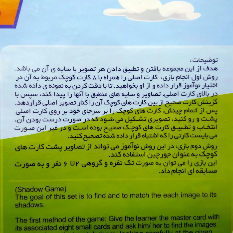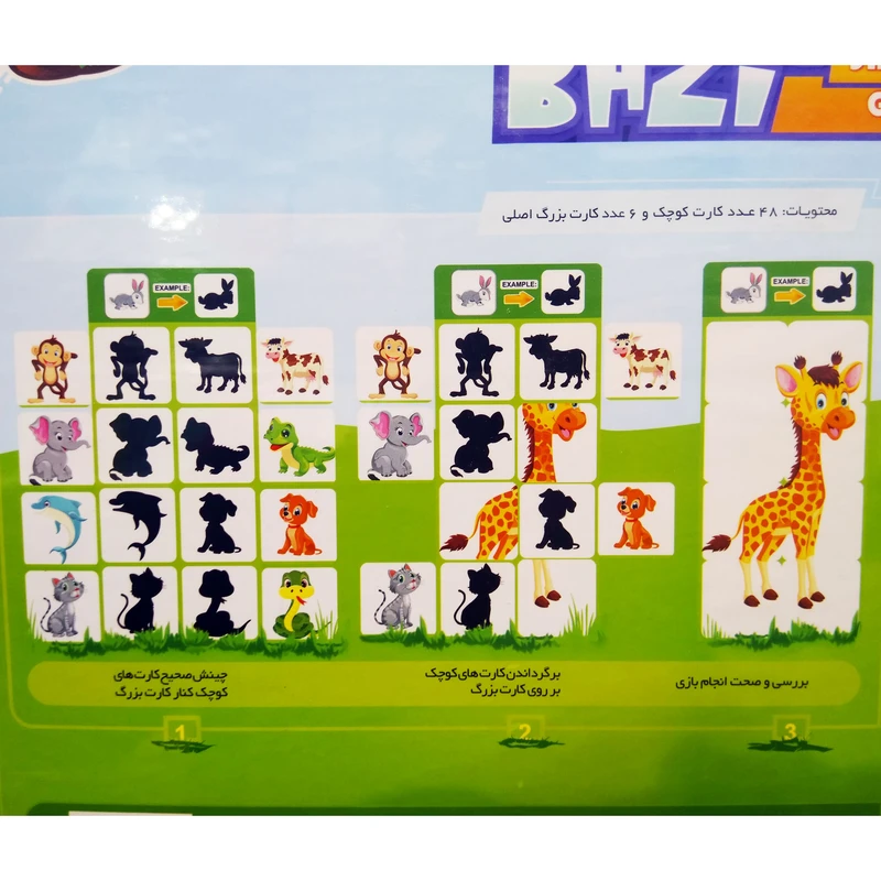 کارت اصلی را همراه با 8 کارت کوچک مربوط به آن در اختیار نوآمور قرار داده و از او بخواهید تا با دقت کردن به نمونه ی داده شده در بالای کارت اصلی، تصاویر و سایه های منطبق با آنها را پیدا کند.